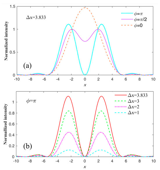 where the ϕ is the phase difference between these two dipole sources. If we set ϕ as 0, π/2, and π, respectively, and take Δx = 3.833, the light intensity distribution curves can be plotted for the above three cases, as shown in Figure 1a. When ϕ = 0, the light intensity is a single peak curve, so that these two dipole sources cannot be distinguished; when ϕ = π/2, the light intensity is a double-peak curve with a minimum value of 0.73, which means these two dipole sources can be marginally resolved according to the Rayleigh criterion; when ϕ = π, the light intensity plot is squeezed and the two peaks are more uplifted with a central value of 0, which means the resolution can be improved continuously. To explore the resolution limit in this case, we reduce Δx gradually, and plot the light intensity curves in Figure 1b. It can be seen that, as Δx decreases continuously, the light intensity distributions are always double-peak curves with center intensity of zero, but the intensity of two peaks will decrease gradually, and the center position of the peaks will move toward slowly. This means that, as long as the phase difference between the two dipole sources is π, no matter how close they are, they can be resolved. Therefore, the resolution limit can be determined by the signal-to-noise ratio of the actual imaging system.
