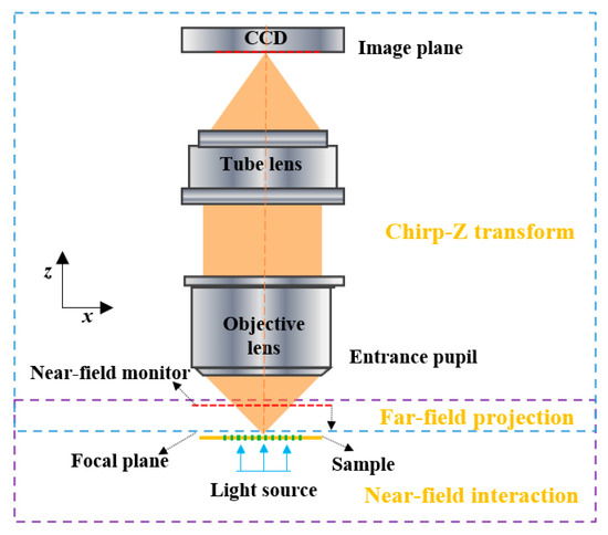 The imaging process of a microscope can be divided into three steps: firstly, the interaction between the illumination light and the imaging target, which forms a near-field light field around sample surface; secondly, the projection of the near-field light field from sample surface to the focal plane of objective lens; and, finally, the propagation of the light field at the focal plane to the image plane, passing through the lens group, and imaging at the image plane, as illustrated in Figure 2. The interaction between the incident light field and the nano-structures at sample surface can be simulated using the finite-difference time-domain (FDTD) algorithm; the far-field projection from the near-field monitor to the focal plane can be calculated by the angular spectrum theory; and, finally, the propagation from focal plane to image plane can be calculated using Chirp-Z transform.