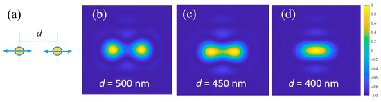 In order to verify the correctness of the above imaging model, firstly, two polarized dipoles along x direction with the wavelength of 500 nm are used to demonstrate the imaging resolution of the microscope. The two dipoles are located at the focal plane of the objective lens and separated by a distance d along x direction, and they have the same wavelength, phase, polarization, and intensity, as shown in Figure 3a. Here, an objective lens with the highest numerical aperture (NA = 0.9) is selected, whose resolution is closest to the ideal diffraction limit. When d = 500 nm, they are clearly distinguishable, and the imaging results are shown in Figure 3b; when d = 450 nm, the two diffraction spots overlap slightly in space, but they are still distinguishable, as shown in Figure 3c; when d = 400 nm, the two diffraction spots at the image plane have overlapped completely, and they are no longer distinguishable, as illustrated in Figure 3d. This yellow-blue pseudo color figure shows the normalized light intensity distribution on the image plane. The closer to yellow, the greater light intensity, and the closer to blue, the smaller light intensity. The following simulated imaging results are the same, so we have omitted their respective scales and labels. Obviously, the minimum resolvable distance for this objective lens is around 450 nm, which is consistent with the diffraction limit of coherent illumination.
