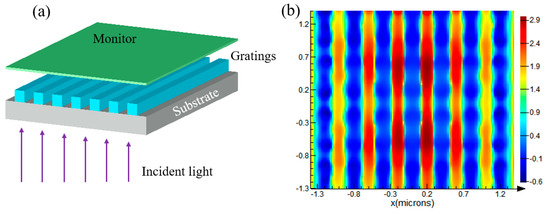 Typically, we use nano-grating structures to demonstrate the modulation of light phase, as shown in Figure 6a. A plane wave with a wavelength of 500 nm was set as the incident light, and the grating structures are composed of SiO2 substrate and a grating layer with a refractive index of 2, which has a period of 400 nm and a thickness of 250 nm. After passing through the substrate and the grating layer, the light rays reach the near-field monitor, and the light phase distribution at this monitor is demonstrated in Figure 6b. The phase difference between gratings and grooves is around π, which matches the theoretical value very well.