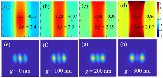 In the practical imaging process, there are two key parameters that should be investigated carefully prior to the widespread use of this scheme. The first parameter is the gap between the optical mask and the sample, denoted by g, which significantly influences the phase difference, as the light field changes continuously in the process of propagation from the sample surface to the far-field. Here, we use four near-field monitors to record the phase distribution above the grating structures, and the gap is set to 0 nm, 100 nm, 200 nm, and 300 nm, respectively. The recorded phase distributions are shown in Figure 8a–d, where the phase difference Δϕ gradually decreases with the increasing of the gap. When the imaging target of the three-hole structure with a period of 400 nm is located at these positions of the near-field monitors, the imaging results obtained are illustrated in Figure 8e–h. As the phase difference between two adjacent holes decreases, the imaging results deteriorate gradually, until the gap is 300 nm, at which point the three holes are completely indistinguishable. Therefore, a non-contact imaging mode is possible, but the gap between the optical mask and the sample’s surface should be less than half a wavelength.