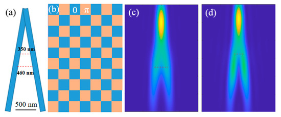 To further verify the feasibility of this scheme, we select a slightly more complex imaging target, which is composed of two lines with an included angle of 10°, as shown in Figure 10a. Here, a gridded optical mask was designed for general samples, whose structure is shown in Figure 10b. After passing through this optical mask, any two adjacent units will obtain a particular phase difference of π. If the size of the grid unit is 300 nm, it means that any two objects with more than 300 nm separation must be located in two different units, so they can be resolved. The imaging results are simulated in Figure 10c,d, with and without the optical mask, respectively. For this sample, the imaging resolution can be determined using the bifurcation position of the angle. In Figure 10c, the two lines can be distinguished precisely with a distance of 460 nm, while, in Figure 10d, the two lines can be distinguished precisely with a distance of 350 nm. The imaging results show that this type of optical mask is suitable for general samples.