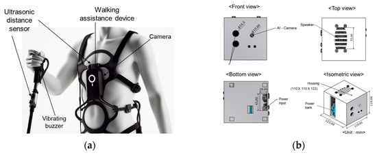The walking assistance device developed in this study is designed to attach an ultrasonic sensor to a cane (Zhenjiang kimtex industrial, Zhenjiang, China) and is intended for attachment to the front chest area of the visually impaired individual in Figure 1a. To identify obstacles appearing around the user’s upper body and provide immediate information, the device integrates an ultrasonic sensor (Shenzhen Wufang Electronic Technology Co., Shenzhen, China), a camera (DFRobot, Wuhan, China), and a portable battery (Xiaomi, Beijing, China). The frame of the walking assistance device was fabricated using a 3D printing material suitable for attachment to the human body. Such a design approach maximizes user convenience and minimizes discomfort during prolonged wear. The device is manufactured in a type of band, making it easy to put on and take off. With overall dimensions of 110 × 110 × 121 mm in Figure 1b, its lightweight design ensures that even the elderly and children can use it easily. The primary material of the device is EN-PLA, and its total weight is 750 g.