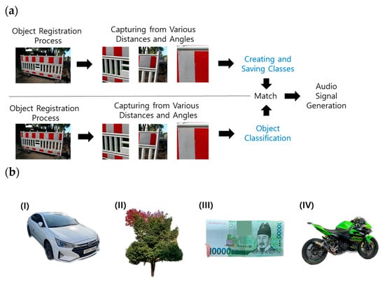 Deep learning-based recognition conceptual framework and sample of obstacle images. (a) Conceptual framework of system. (b) Obstacle image samples: (I) car, (II) tree, (III) korean 10,000 won bill, (IV) motorcycle.