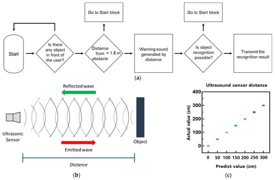 A flow chart of the proposed algorithm, distance measurement-utilizing ultrasonic sensor, and working principle, with measurement results based on distance (a). When there is an object in front of the user, object detection is performed by measuring the distance. And object recognition is performed on the type of object. (b) The ultrasonic sensor distance measurement method. (c) The detection rate based on actual distance.