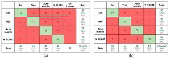 To evaluate the performance and object recognition capability of the camera model, we utilized a confusion matrix. The training data included four objects: ‘Car’, ‘Tree’, ‘Automobile’, and ‘10,000 Won’. To confirm the efficacy of the model, we tested it using both real object images and photographic images. The image sensor used for object recognition uses a two-megapixel CMOS camera. The object recognition executed in Figure 5 was tested by setting the distance between camera objects to 1 m. Figure 5a,b depict the confusion matrices of the test set results predicted based on real object images and photographic images, respectively. Diagonal values in the confusion matrix represent the number of instances correctly classified. The results from Figure 5 show a high accuracy of 100% from 200 tests, indicating that the model is very effective in tests based on photographic images. In contrast, the results in Figure 5a show an average accuracy of 91.5% when using real object images, meaning that it has a slightly lower accuracy compared to tests using photographic images. These results suggest that expanding the diversity of data and further improving the model could yield higher accuracy.