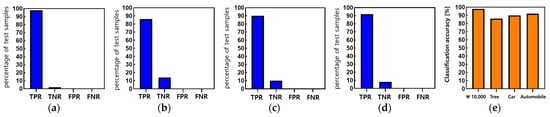 The object recognition accuracy: (a) KRW ten-thousand note, (b) tree, (c) car, (d) motorcycle, (e) classification results of all objects.