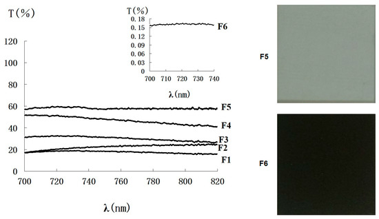 The transmittances of six types of nonselective linear absorption filters (Fs) vs. the wavelengths. The right is a photograph of F5 and F6, respectively.