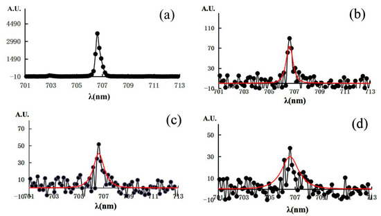 Spectrum broadening at 706.62 nm is shown in Figure 3, where the points denote the experimentally measured spectra (the same in Figure 4 and Figure 5). Figure 3a is the initial spectrum without passing through the absorption filter (the same for subfigure (a) in Figure 4 and Figure 5 below), while Figure 3b–d give the spectra for the absorption filters with transmittances T of , , and , respectively. The corresponding optical powers of this spectral line after passing through the absorption filters can be estimated by and are , , and , respectively. Compared to Figure 3a, there is slight broadening in the spectrum of Figure 3b. The broadening becomes evident in Figure 3c,d. Spectrum broadening starts from the lower part of the spectral line. And the lower the transmittance of the filter, the more evident the broadening.