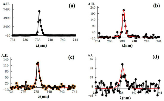 Figure 5 shows spectrum broadening at 738.27 nm. The transmittances of the filter corresponding to Figure 3b–d are , , and , respectively. And the optical powers of the spectral line are , , and , respectively. One can see that in Figure 5, the broadening of the spectral line in Figure 5b–d is slower than that in Figure 3b–d and Figure 4b–d. The broadening can only be seen evidently in Figure 5c,d. The optical powers of the spectral line corresponding to Figure 5b–d are, respectively, larger than those corresponding to Figure 3b–d or to Figure 4b–d. Comparing these three groups of experimental results, it is easy to see that the smaller the optical power of the spectral line, the easier it is to observe the broadening effect of the spectral line. This is because, according to ref. [16], the smaller the optical power of the spectral line, the more evident the shortening of the coherence length.