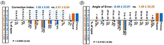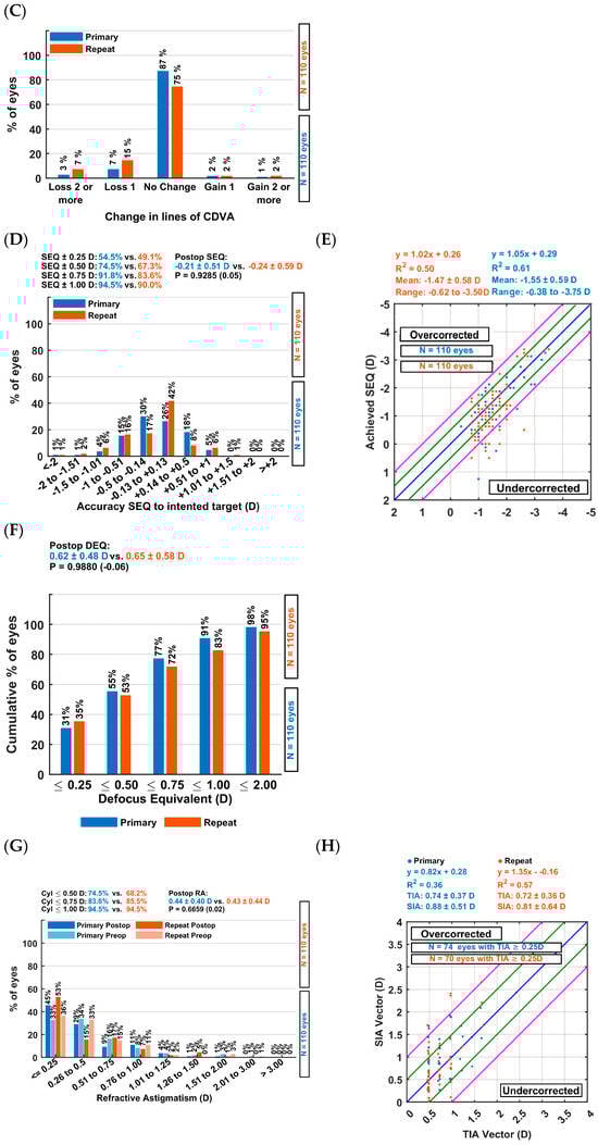 Standard graphs for reporting refractive surgery outcomes (2011): Primary PRK versus repeat PRK groups. VA = visual acuity, UDVA = uncorrected distance visual acuity, CDVA = corrected distance visual, SEQ = spherical equivalent, D = diopter, TIA = target-induced astigmatism, SIA = surgically induced astigmatism. VA presented in Snellen format. (A,B) Efficacy; (C) Safety; (D,E) SEQ Accuracy; (F) DEQ Accuracy; (G–J) Astigmatism Accuracy.