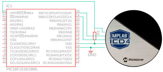 The basic circuit for programming a digital signal processor using MPLAB ICD 4. The resistance of the resistor is 50 kΩ. The actual digital signal processor used in the study was dsPIC30F6010A. Five lines are required for communication between MPLAB ICD 4 and the digital signal processor: Vdd, Vss, Vpp/MCLR, PGC, and PGD.