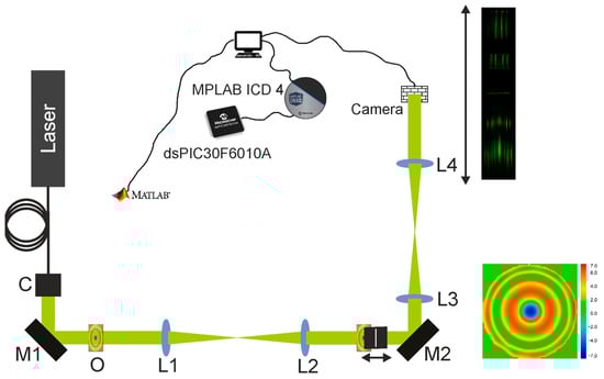 The optical system is schematically shown in Figure 2. A beam coming from the laser is collimated by the fiber collimator C. Next, it is deviated by the mirror M1 followed by two aligned 4-f systems. A two-dimensional object was placed at the primary focal plane of the first lens L1 of the first 4-f system. A horizontally and vertically flipped copy of the original object was formed at the secondary focal plane of the second lens L2 of the first 4-f system. At this plane, a horizontally orientated slit was scanned vertically to cut out the vectors or one-dimensional phase objects to be retrieved. These objects were distorted one-dimensional wavefronts that were selected randomly. The size of the two-dimensional object was 64 by 64 pixels, and the 21st, 33rd, and the 55th (counting from the bottom) vectors were selected as objects. As mentioned in Section 2.1, these one-dimensional wavefronts were the objects to be retrieved by the MPGS algorithm. The slit was followed by the mirror M2 that, in turn, was followed by the second 4-f system, which consisted of the lenses L3 and L4. A camera was moved around the secondary focal plane of the second lens L2 of the second 4-f system to capture the Fresnel diffraction patterns at all planes. The bit depth of the camera was 8 bits. Centroids were calculated from the diffraction patterns captured at the central plane . The data were leveled in software Gwyddion as there was tilt present in the retrieved vectors. The tilt was due to the shifts of centroids from one plane to another; meanwhile, during data processing, the coordinates of the centroid were fixed. During data processing, the centroid of the central image was always used.