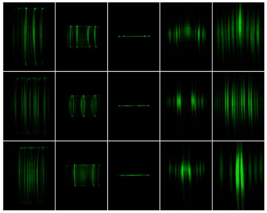 Diffraction patterns of the test objects, i.e., the 21st, the 33rd, and the 55th vectors (counting from the bottom). The vectors, i.e., the test objects, were cut out from the two-dimensional object via the slit. The planes change along the horizontal direction (from 1 to 5).