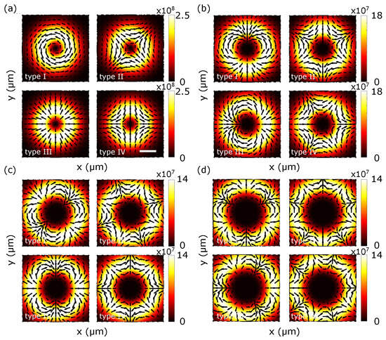 Excitation of surface plasmon polaritons with type I–IV vector beams. Distribution of the electric field and magnetic field lines for vector beams (a) m = 1, type I, (b) m = 1, type II, (c) m = 1, type III, and (d) m = 1, type IV, (e) m = 2, type I, (f) m = 2, type II, (g) m = 2, type III, and (h) m = 2, type IV, (i) m = 3, type I, (j) m = 3, type II, (k) m = 3, type III, and (l) m = 3, type IV, (m) m = 4, type I, (n) m = 4, type II, (o) m = 4, type III, and (p) m = 4, type IV. Scale bar is 500 nm.