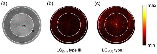 An optical microscope image of the Bragg grating in shown in Figure 4a. The two circumferences represent the inner and outer rings. The inner ring radius is 20 μm. We particularly focus on the experimental results, and we show the excitation of SPPs with vector beams type III (Figure 4b) and I (Figure 4c). We observe the excitation of SPPs thanks to the extra momentum added by the Bragg grating. We also observe the propagation of the excited SPPs towards the center of the grating for type III beams, whereas no excitation of SPPs is obtained for type I beams, as expected.