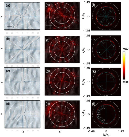 Excitation of SPPs with combinations of vector type I and III beams. Scheme of distributions (a) D1, (b) D2, (c) D3, and (d) D4. The white lines represent the inner and outer grating rings. Leakage radiation images of SPPs in (e–h) the direct and (i–l) Fourier spaces for distributions D1, D2, D3, and D4, respectively. Arrows indicate the sections where leakage radiation was detected. Insets in (e–h) are magnifications in the center of the grating. Scale bar is 10 μm in (a–h).
