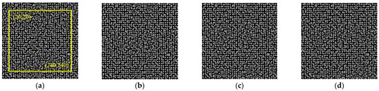 In this study, an open-source software called Glare (20211121) [43] was utilized to generate speckle patterns and corresponding deformation images. The selected speckle parameters in the software are as follows: diameter of 4 pixels, compactness of 60%, and a degree of 40%. This article does not consider the impact of speckle parameter settings on the calculation results, which will be analyzed in subsequent research. The size of the image was 260 pixels × 260 pixels, and the region of interest was 220 pixels × 220 pixels, with 48,400 points of interest. The strain and , with Gaussian noise with a mean of 0 and different standard deviations of 0.01 (2.55 bit) and 0.02 (5.10 bit). The DIC method adopts a first-order shape function, calculates a subset size of 21 pixels × 21 pixels, and uses the normalized least square distance (ZNSSD) function for matching.
