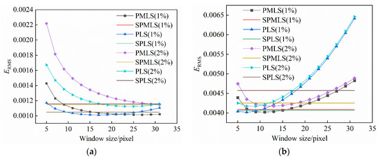 As shown in Figure 4a, when calculating displacement field , the optimal accuracies of PMLS (1%), PLS (1%), SPMLS (1%), SPLS (1%), PMLS (2%), PLS (2%), SPMLS (2%), and SPLS (2%) were 0.0010, 0.0010, 0.0011, 0.0011, 0.0011, 0.0011, 0.0012, and 0.0012, respectively. The optimal window sizes for PMLS and PLS were relatively large. This is because the computation errors for low-gradient strain fields are dominated by random errors, and increasing the computation window size reduces random errors. The accuracy obtained by the SPMLS and SPLS was close to the optimal accuracy of the PMLS and PLS. It can be seen that both SPMLS and SPLS selected computation window sizes close to optimal when computing low-gradient strain fields. Both methods are suitable for computing low-gradient strain fields. As shown in Figure 4b, when calculating displacement field , the optimal accuracies of PMLS (1%), PLS (1%), SPMLS (1%), SPLS (1%), PMLS (2%), PLS (2%), SPMLS (2%), and SPLS (2%) were 0.0040, 0.0040, 0.0041, 0.0041, 0.0042, 0.0042, 0.0043, and 0.0046 respectively. The optimal computation window sizes for PMLS and PLS were relatively small. This is because the computation errors for high-gradient strain fields are dominated by systematic errors, which increase as the computation window size increases. The calculation accuracy of the SPMLS method was nearly identical to the optimal value of the PMLS method, with a variance of less than 2.5%. The computational performance of SPLS (1%) was excellent, but SPLS (2%) performed poorly. This is because larger noise levels affect the determination of the optimal computation window size for both SPMLS and SPLS, with PLS being more sensitive to changes in computation window size compared to SPMLS.
