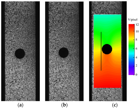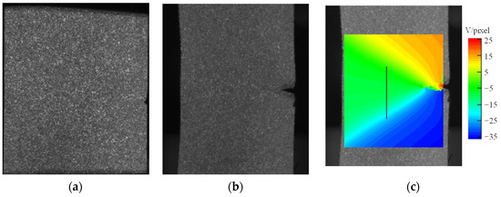 The reference image and the deformed image are shown in Figure 5a,b and Figure 6a,b. The subset size was 31 pixels × 31 pixels, and the other calculation parameters were the same as in Section 3. The displacement field obtained by DIC analysis is shown in Figure 5c and Figure 6c. The displacement field was fitted using the quadratic basis function PMLS method and SPMLS method. Since the true strain field in actual experiments is unknown, the optimal parameters of the PMLS method cannot be accurately determined. Therefore, the PMLS method selection windows were 7, 13, 19, 25, and 31, which are represented as PMLS-7, PMLS-13, PMLS-19, PMLS-25, and PMLS-31, respectively. The calculation results of strain at the black line in Figure 5c and Figure 6c were selected to be compared with SPMLS, as shown in Figure 7.