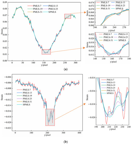 Figure 7 proves that the selection of window size in the PMLS method significantly affects its computational results. As shown in Figure 7a, when calculating “sample13”, due to significant strain variations, each region was affected differently by noise. In high-strain regions, the impact of noise was relatively minor, resulting in less variation in the strain curve. Conversely, in low-strain regions, the influence of noise was more pronounced. The difference in smoothness between PMLS-7 and PMLS-13 is attributed to smaller computation windows leading to larger random errors caused by noise. In contrast, PMLS-19, PMLS-25, and PMLS-31 demonstrated better smoothness. The strain curves of SPMLS closely resemble those of the latter three methods in low-strain regions, showcasing excellent noise reduction and smoothing capabilities. However, in high-strain regions, the strain curves of SPMLS are closer to those of PMLS-7 and PMLS-13, indicating poorer smoothness. This is because SPMLS tends to revert to DIC displacement field strain in high-gradient areas, thereby opting for smaller computation windows.