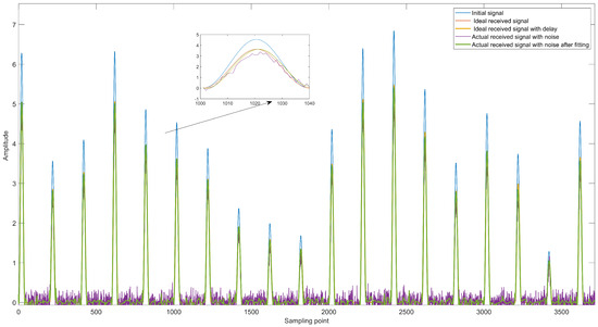 Figure 5. Among them, the blue solid line represents the initial signal sent, the orange solid line represents the ideal received signal, the yellow solid line indicates the signal received by external factors with delay, the purple solid line indicates the signal actually received with noise, and the final green solid line indicates the signal after LS processing. In order to make a more intuitive comparison, we have specially inserted an enlarged image of one of the pulses in the diagram. It can be seen that the waveform after LS is closer to the orange solid line than the actual received signal, which is the ideal received signal. It can be seen from this that LS has a good performance in terms of time compensation.