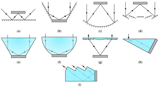 Schematic simplified images of the basic elements of solar concentrators of the type: (a) Flat reflector [14]; (b) V-trough [15,16,17]; (c) Parabolic dish/trough [18,19,20,21]; (d) Linear Fresnel reflector [22,23,24,25,26,27]; (e) Light funnel/homogenizer [7,28]; (f) Compound parabolic concentrator [29,30,31]; (g) Fresnel lens [32,33,34]; (h) Wedge prism [35,36]; (i) Wedge prism with planar waveguide [37].