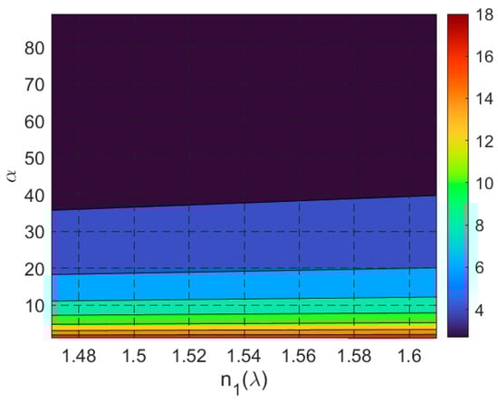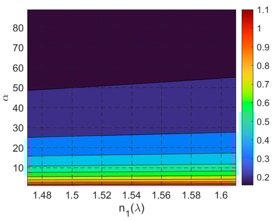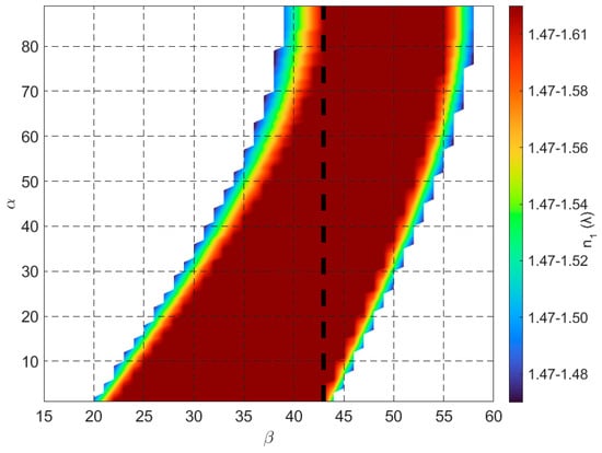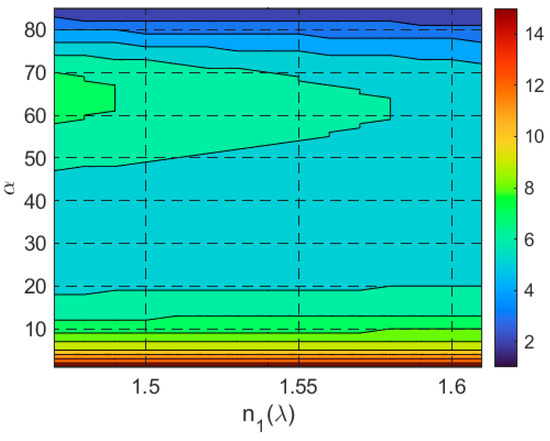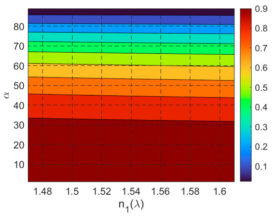 where . The solution region for these constraints is illustrated in Figure 4, where the abscissa represents the angle (inclination of the side faces), and the ordinate represents the angle (angle of incidence on the input face). The intensity map highlights the solution regions for different ranges of the cell’s refractive index .
