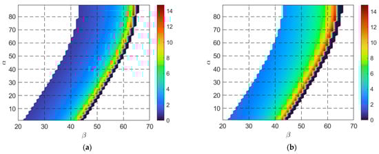Graphical illustration of the solution region of the system of inequalities (7) for the case when (a) the minimum length () and (b) the maximum length () of a unit cell are calculated. The color school corresponds to the value of the parameter.