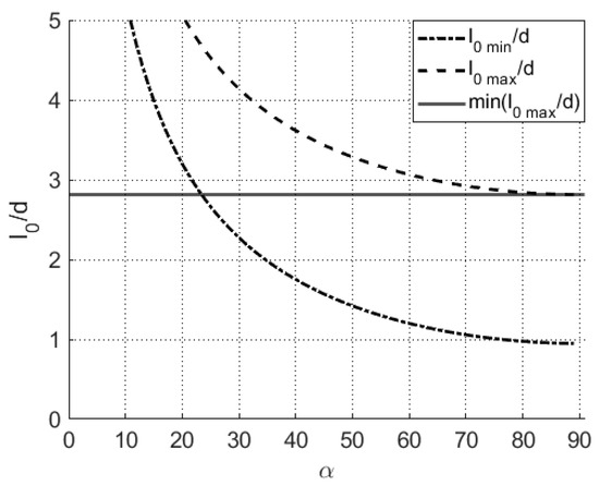 Figure 7 presents a graphical illustration of the solution region for this relationship, while Figure 8 shows a cross-section of the two-dimensional distributions from Figure 7 for . As previously established, this angle of inclination ensures maximum AA () when the cell is made of a material with a refractive index in the range of 1.47 to 1.61. The functions describing and define the permissible limits for the cell length .
