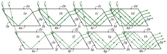 - Repetition Across Cells: The wave exits plate (1b), and the process repeats for each subsequent cell in the row. The propagation concludes at the exit of the final cell, after which the wave travels to the radiation receiver (not shown in Figure 9).