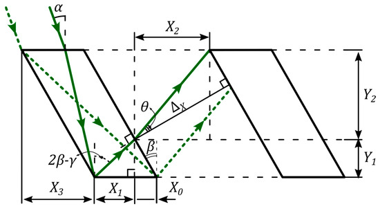 The aperture of the beam at the exit from the cell corresponds to the projection of the aperture onto the horizontal axis. This projection is defined as the difference in the optical paths of the dashed and solid beams in the horizontal plane (see Figure 5b). Thus, can be calculated as follows: