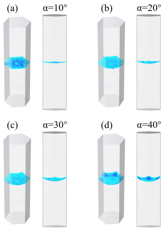 The profile of the liquid surface in the cylindrical microholes with α of 10°, 20°, 30°, and 40°, respectively.