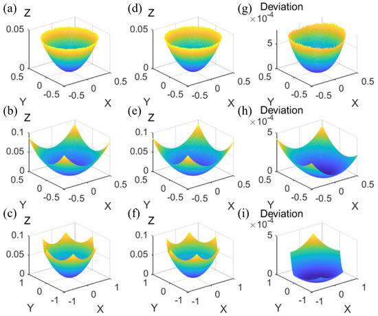 For spherical aberration, we can obtain spherical aberration along the y-axis and spherical aberration along the x-axis, as shown in Figure 9. Compared to the spherical aberration along the y-axis and the spherical aberration along the x-axis of round microlenses in Figure 9a, Figure 9c shows hexagonal microlenses have a slightly bigger spherical aberration along the y-axis and spherical aberration along the x-axis. For different contact angles, the spherical aberration along the y-axis and the spherical aberration along the x-axis of square microlenses have a slightly more significant change. All three shapes of microlenses have small phase differences.