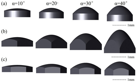 In order to achieve controllable microlens curvature, we establish the controlled surface microlens with an inclined hole wall structure [26] for the study. There is a relationship between the inclination angle of the hole wall, the contact angle formed by the photoresist and the microhole wall, and the curvature of the microlens, as shown in Figure 11. By adjusting the inclination angle of the hole wall, we can obtain microlenses with adjustable curvature. The relationship between the inclination angle β of the hole wall, the contact angle θ formed by the photoresist and the microhole wall, and the contact angle α of the microlens is shown in Equation (21). On the basis of the constant contact angle formed by the photoresist and the microhole wall, by adjusting the inclination angle β of the hole wall, we can obtain microlenses with different contact angles α to realize the adjustable curvature. Compared with a rectangular mold, the microlens mold with inclined hole wall structures is able to achieve adjustable curvature without changing the contact angle formed by the photoresist and the microhole wall.