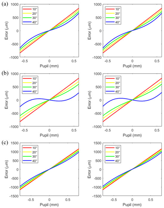 In addition, the meridional plane (which contains the optical axis of the lens) and the sagittal plane (which is vertical to the meridional plane) have different radiuses. Therefore, the meridional and sagittal rays have different focal points. This is called an astigmatism aberration. The spherical aberration along the y-axis and spherical aberration along the x-axis illustrated in Figure 9 are very similar, which suggests that the astigmatism aberration is small.