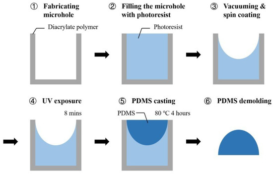 The fabrication method of the microlens is briefly described in Figure 14: First, the microholes are fabricated via 3D printing. Photoresist is poured into the microhole. Then, the photoresist-filled microhole is put into a vacuum machine to remove the air bubbles in the microhole. The microhole is spin-coated. After the microhole is stabilized, the photoresist is cured by exposing the microhole to UV light. In this way, the mold for fabricating the microlens can be obtained. Then, polydimethylsiloxane (PDMS) is poured into the pre-fabricated microhole mold and the microhole is filled. The mold is heated. After the PDMS is cured, the PDMS is demolded from the microhole. In this way, the desired microlens can be obtained.