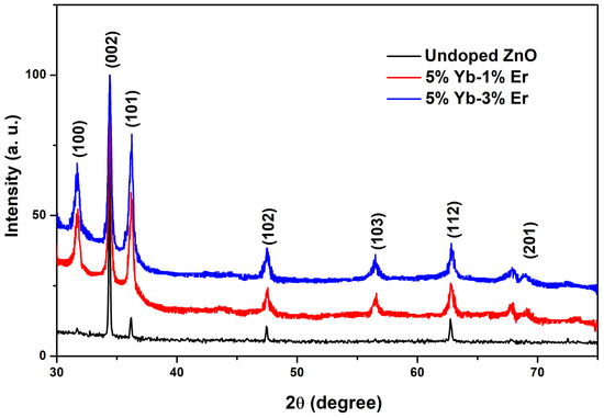 The films were examined with an X-ray diffractometer (XRD, Malvern Panalytical, Almelo, The Netherlands) (X’Pert Pro) (Cu Kα radiation, λ = 0.154056 nm) to determine their phase purity and crystallinity. This diffraction model involves estimating the intensity diffracted by displacing the sample and detector at the same time, with angles of θ and 2θ (using the Bragg–Brentano geometry (θ–2θ)) with a pitch of 0.05° using an integration time of 20 s. A Transmission Electron Microscope (TEM) (JEOL Ltd., Hillsboro, OR, USA) was used to examine the shape of the particles of Yb co-doped Er-ZnO (EYZO) thin films with a point-to-point resolution of 0.19 nm. An energy dispersion X-ray spectroscopic (EDS) (JEOL JSM-6700F, Akishima, Japan) system was employed to determine the compositional analysis of the selected areas. The EDS X-ray detector (JEOL Ltd., Hillsboro, OR, USA) determines the proportion of X-rays that are emitted in relation to their energy range of 0–10 keV. The detector is a solid-state device made of lithium-drifted silicon. At normal incidence in wavelengths between 300 and 1000 nm with an accuracy of 0.08 nm in the UV-Vis region, the Lambda 900 UV/VIS/NIR (Perkin Elmer, Waltham, MA, USA) spectrometer measures the spectral optical transmission. We employed a double-beam recording spectrophotometer that has the ability to operate in either transmission mode or reflection mode. It is made up of three main elements: the radiation source, the sample holder, and reference. Photoluminescence (PL) measurements were made at room temperature and a 355 nm excitation line was used in a frequency-tripled neodymium-doped yttrium aluminum garnet Nd-YAG laser (HORIBA, Kisshoin, Minami-ku, Kyoto, Japan). The electrical properties of the films were evaluated at room temperature by utilizing an ECOPIA Hall effect (Ecopia Semiconductor, Suwon, Republic of Korea) measurement system.