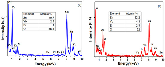 Figure 3 displays the EDS spectrum for co-doped thin layers, with varying levels of Er. The presence of various constituent films, such as oxygen, zinc, ytterbium, and erbium, as well as some impurities such as silicon and copper, can be seen in these spectra. This study’s main objective is to compare the concentration of dopants in the starting solution with the concentration obtained after deposition. In the tables included in the figures above, we report the percentages of Zn, O, Er, and Yb obtained through this analysis. The detection limit of EDS in TEMs is practically about ~0.5 atomic % for most elements. When compared to the nominal value and the percentage values of Er and Yb, the concentrations are slightly understated. According to the EDS studies, the ratio [Zn]/[O] is less than 1. This indicates that zinc oxide sis not form stoichiometrically with a lack of zinc and, therefore, an excess of oxygen, and this could show that Er and Yb were in the form of oxides in the ZnO film on the one hand, and part of it is due to the glass substrate (SiO2) on the other hand.