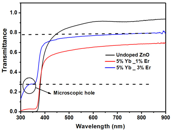 Figure 4 shows the optical transmission spectra of ZnO (Yb-Er) thin films. We find that all layers of EYZO have an optical transmission that varies between 66% and 79% when the concentration of erbium increases. The marked decrease in transmission for λ < 500 nm is related to the increase in absorption in this region. We note that the fraction in the absorption edge is abrupt and shifts to short wavelengths as the Er concentration increases. This displacement of the absorption edge is normally related to the difference in the optical gap of the layers. Porosity, defined as the void fraction in the volume of the porous layer [28], depends on the deposition temperature–deposition time. It is seen in Figure 4 that the ZnO layer: 5% Yb-3% Er has a bump in the area of high absorption. The shape of this transmission pattern is attributed to that of a porous layer [29]. The conclusion that we can draw is the existence of a microscopic pore; this result can be analyzed using the BET method (Brunauer, Emmett and Teller) [30] and controlled via annealing.