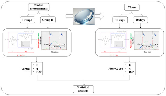 Although biometric measurements were used for contact lens fitting, biomechanical data were processed to obtain the intraocular pressure (IOP), corneal elasticity (E) and viscosity (ɳ). While IOP is directly provided by the ORA’s instrument, E and ɳ are computed by applying a previously reported Standard Linear Solid Model [21] to the ORA applanation/pressure curves (insets in Figure 1). The experimental protocol started with a pre-lens baseline dataset for both participant groups. Before starting SiH-SCLs wear, all participants were measured with the ORA device and then IOP, E and ɳ were established as a baseline. Immediately after the baseline measurements, subjects were instructed in the daily handling and manipulation of their contact lenses by a clinical optometrist, beginning the corresponding wearing period. Figure 1 schematizes the experimental procedure: after 10 and 20 days of respective SiH-SCL use, each subject’s cornea was analyzed with the ORA device immediately after the CL removal. Then, IOP, E and ɳ parameters were recalculated for each group.