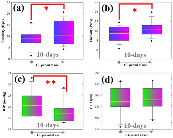 Figure 2 shows box plots comparing the changes in elasticity (Figure 2a), viscosity (Figure 2b), intraocular pressure (Figure 2c) and central thickness (Figure 2d) induced by the use of SiH-SCLs over the shorter period of 10 days. Statistical analysis revealed that after 10 days of SiH-SCL use, corneal elasticity and viscosity changed (increased) significantly. Furthermore, IOP was significantly reduced. However, although a slight increase in central thickness (Figure 2d) was observed, this was not relevant.