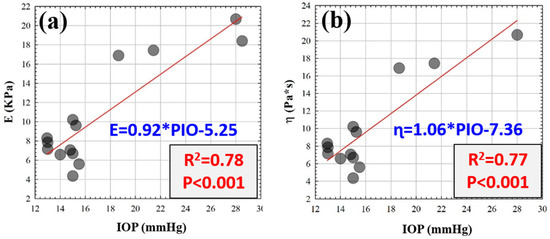 Elasticity (a) and viscosity (b) as a function of the intraocular pressure (IOP). Red lines correspond to the linear fittings.
