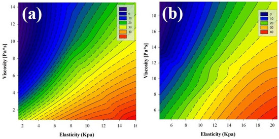 According to previous results, if, on the one hand, E and ɳ increase while IOP decreases after 10 days of SiH-SCL wear, and on the other hand, E and ɳ increase with IOP, there should be an inter-correlation between the three parameters, such that the joint increase in elasticity and viscosity results in a relaxation of IOP. This effect is illustrated in Figure 4. Contour plots plot viscosity versus the elasticity as a function of the IOP before (pre-lens wear measurements) (Figure 4a) and after using SiH-SCLs (Figure 4b) for 10 days.