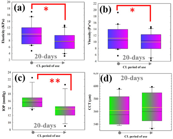 Box diagrams of elasticity (a), viscosity (b), intraocular pressure (c) and central corneal thickness (d) comparing baseline (pre-lens wear) measurements and those after the wearing period of 20 days. For each box, the median (central line inside each box), the Q1 and Q4 quartiles (lower and higher borders of each box, respectively) and maximum and minimum values (whiskers) are shown. (* p < 0.05; ** p < 0.005).