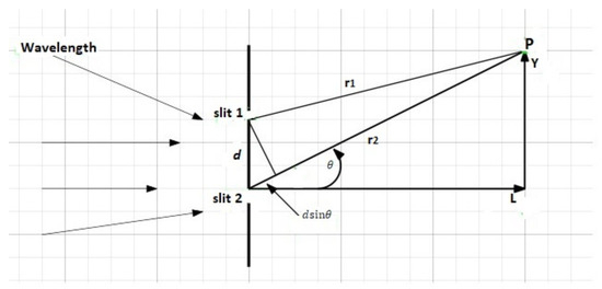 Let and be the distances from and to the point P of height y on a screen placed at L from the gratings with diffraction angle , as shown in Figure 2 and Figure 3. For a uniform separation d between slit and , the generic optical field at any distant point P on the screen is expressed as the sum of the fields produced from the two slits by linearity: