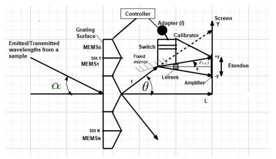 For that purpose, this paper proposes a controlled detection that is most needed for micro- and nanoplastic detection, from the controlled gratings to the controlled etendue geometry of the display unit, making most of the components not to be directly wavelength-dependent. This comes from the fact that most of the components in the spectroscope currently operate within a particular wavelength range, and to achieve a universal spectroscope with a wide wavelength range capability, it requires, at each component level, several types of components with different wavelength ranges, which, not only is costly, but requires a bigger space. It is worth mentioning that universality refers to spectroscopy/photometry diversity in technique (Raman, IR, …), several applications (micro- and nanoplastics and particles, pathogens…), spectroscopy principles (scattering, emission, transmission), and acquisition and sharing techniques: hence, a suggestion of an automation solution through control of pivotal components is presented in this paper. The role of controlling grating pattern is to enhance a multi-wavelength capability of the slit-width of the diffraction grating through a dynamic diffraction grating; and of the geometric etendue. Dynamic diffraction gratings are gratings where one or two optical or geometrical properties can be actively controlled to accommodate the incoming light beam. This is achieved by integrating Micro-Electromechanics System (MEMS) technology with diffraction grating, which provides not only an efficient way to build truly miniaturized optical systems, but also a possibility to achieve a dynamic system. Dynamic grating is achieved through the tunability of the grating system that varies its pitch and slit geometric values. MEMS actuators are employed to achieve tunable gratings, to dynamically change the diffraction properties to yield wavelength sensitivity. Different MEMS approaches to tuning gratings have been constructed by means of grating light valve [6], microfluidic actuation [7], piezoelectric actuation [8], electrostatic actuation [9], and thermal actuation [10]. Recently [11] developed a water-based thermal actuation, which provides us with arguments to lean on such an actuation in the future. Without going through the discussion or analysis of one or another MEMS technology, this paper provides the displacement of the actuator making up the MEMS, and the generic operability condition of the controlled function that must be satisfied for the grating tunability and adaptation of the geometry etendue on the display unit. That is, tunability of grating means tunability also of the geometry etendue.