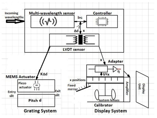 The MEMS is on the diffraction grating side and not directly wavelength-dependent. However, through it, the controller ensures that an incoming wavelength emitted or transmitted from the sample is accommodated by triggering the actuation that causes the pitch tunability conferred to the grating by the MEMS. In fact, the MEMS yields the required slit-width by modifying the pitch in accordance with the MEMS function , with being the added to or subtracted from d (this analysis adds) as per controller instruction. The MEMS does so through its piezo-actuation capability. More details on these devices are given further in Section 4.
