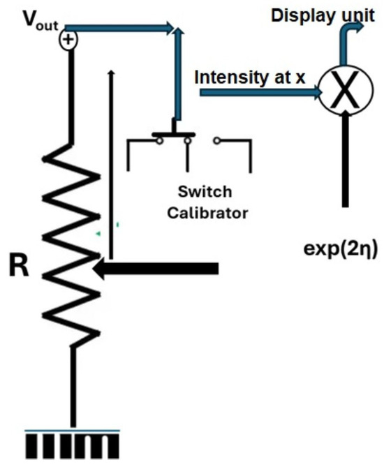 After reflecting on the mirror and prior to reaching the display unit, the signal is magnified by an amplifier according to the values of and the LTU-associated reading from the adapter, that finds the proper signal level required to increase the number of electron extraction on the etendue of the display unit. Therefore, the function of the adapter is defined by , with x the optimal position determined by the calibrator, the optimal intensity gain, and l the manipulable leveler belonging to the calibrator.