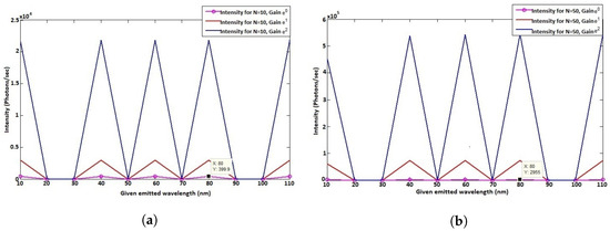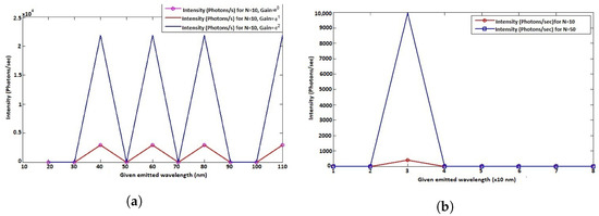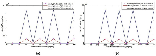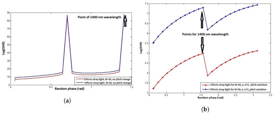 When checking on how the stray light could affect the system in Figure 21, one notices that the signal with variable pitch (Figure 21b) is more affected by the random phases introduced by the stray light than the signal with fixed pitch (Figure 21a), which is normal: first, because the variation of the pitch increases the stray light, and second, because the reduction in the slit-width reduces the signal level, but the major cause is the composition of the stray light itself. As we know, stray light has the same composition as the radiated light [43], and in the absence or reduction in signal on an interval, stray light becomes dominant. However, we observe that the pitch variation shows robustness for the selected wavelengths, from the wavelength, up to , which corresponds to a phase around 1.4–1.5 rad, where it is slightly affected, and an error which is such that for 10 slits. At these points, the signal without pitch variation is wiped out as well as a mid lobe by the noise while our system shows some robustness through the depicted SNR. This comes from the fact that the detection system put in place is multi-bandwidth detection. After 1400 nm, there is almost no signal, hence the dominance of stray light as indicated, but with less intensity. However, by using its amplification provision, as [43] advised to, times the SNR by 10, to which we add a bandpass filter of , with being the difference between the two half-points of the sinc intensity function, and assuming identical entry and exit slits, we can retrieve the required information from the sawtooth-like signal yielded by the stray light effects.